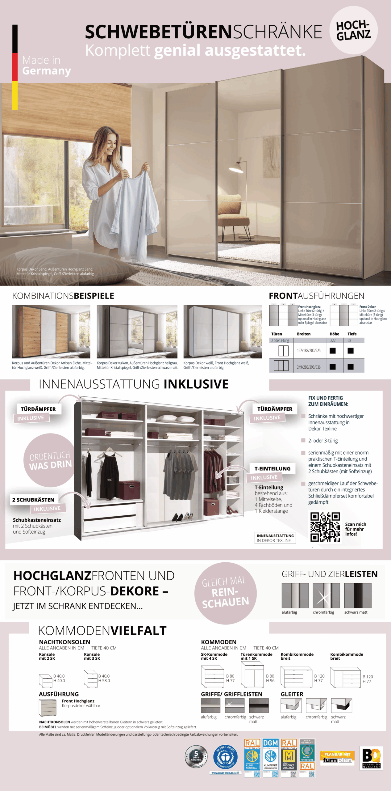 INCLUDO Beimöbel gibt es in teilcolor- und vollcolor-Ausführung. INCLUDO Konsolen und Kommoden sind mit Griffen oder Griffleisten und Gleitern, wahlweise in alufarbig, chromfarbig oder in graphit erhältlich. Konsolen werden, unabhängig von der Wahl der Griffe, mit höhenverstellbaren Gleitern in schwarz geliefert.