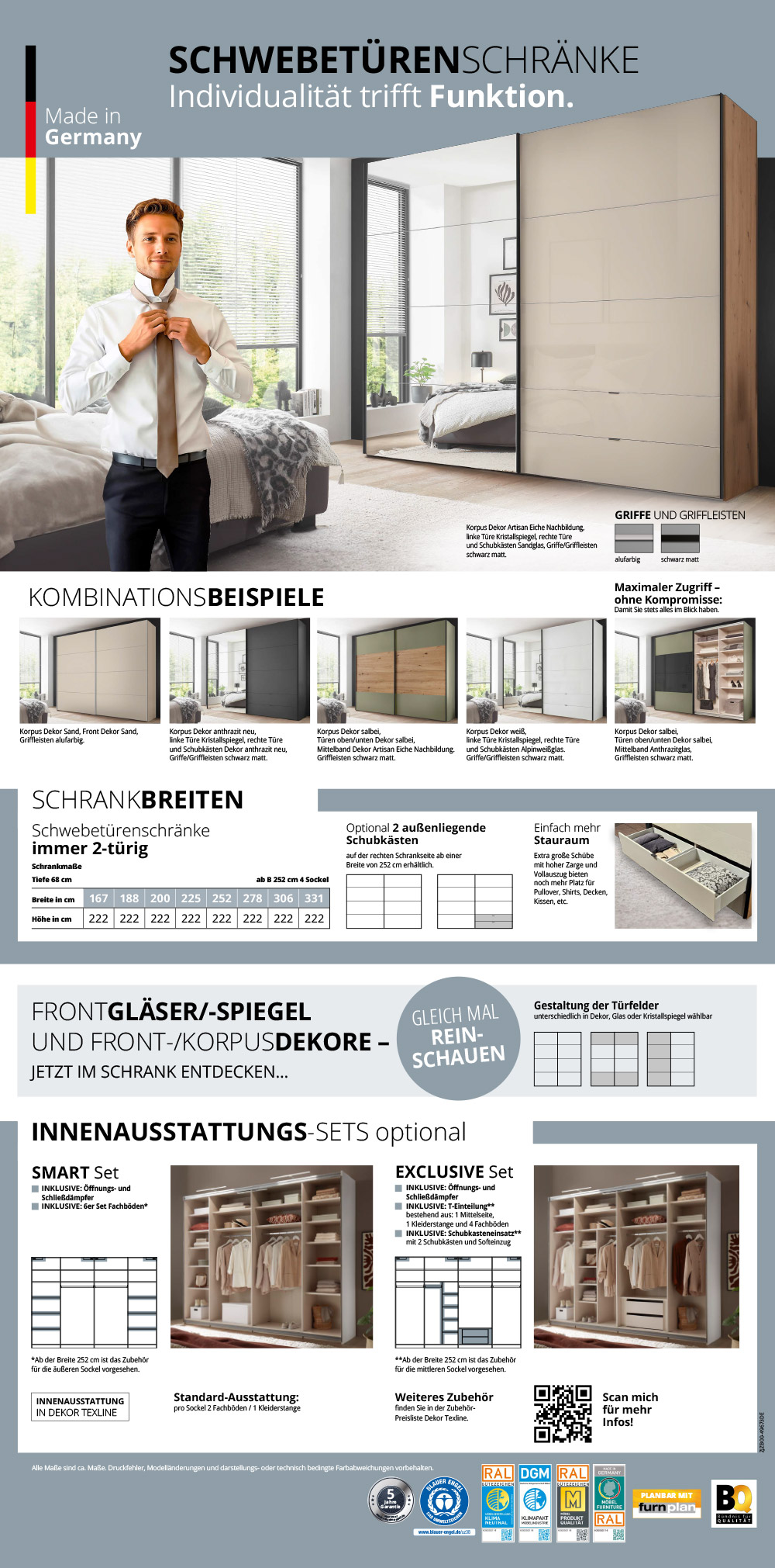 Alle PAROS Schwebetürenschränke werden mit Tiefe 63 cm geliefert.